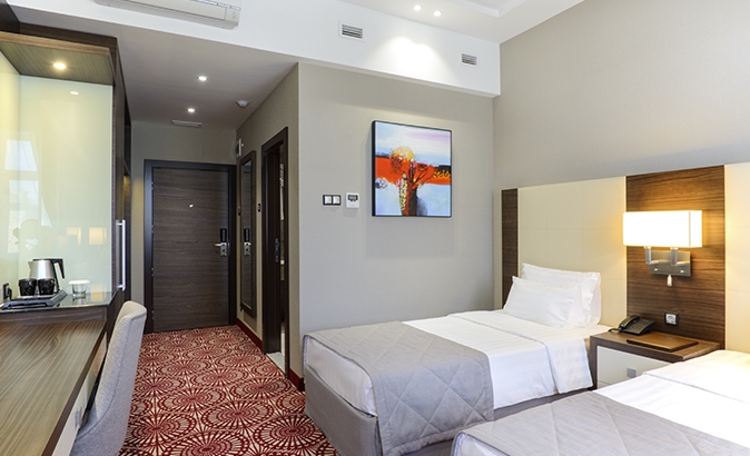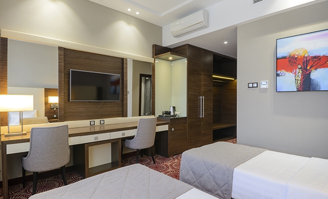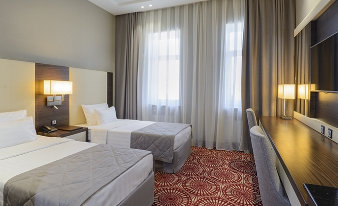 Spacious and stylish rooms that have everything you need for a full and comfortable stay. A harmonious combination of modern design with a comfortable, thoughtful to the smallest detail makes this room an ideal choice for both business and leisure travelers. All rooms of this category have a comfortable and large bed, a work space and a cozy bathroom.