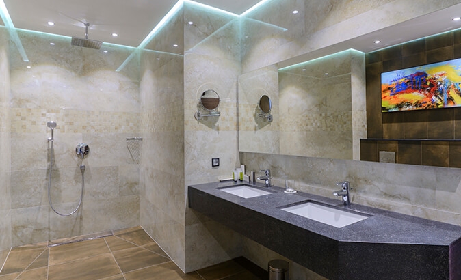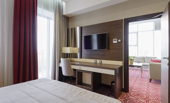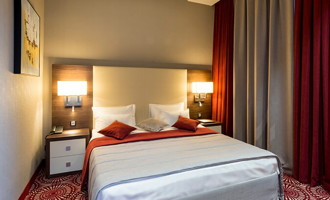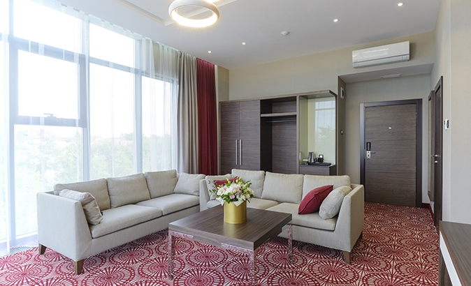 Spacious rooms filled with light and air, the category SUITE, consisting of two rooms – a bedroom and a living room with panoramic windows and a superb view of the city. The comfortable atmosphere of comfort complements modern technical equipment, heated floors, and special amenities in a spacious bathroom. The atmosphere of understated elegance in a modern design room with exceptional comfort.